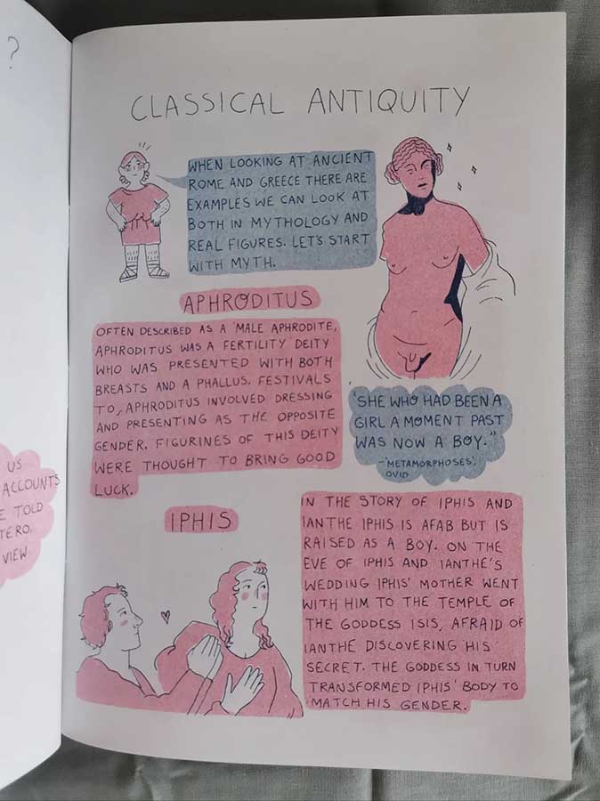 Moving from classical antiquity all the way through to the Stonewall Riots in just 12 pages underlines why Frewin has chosen to use the word “potted” in the zine’s title. It’s a fascinating collection of mini-biographies (usually two or three on a page), alongside short accounts of key moments in trans history. Some of these figures may be familiar to readers – novelist Radclyffe Hall, for example, or sexologist Magnus Hirschfeld – while others will be less so. There’s a fascinating account of the medieval Marinos the Monk, and subjects like 16th century soldier and spy Chevalier D’Eon will entice even the most casual reader into investigating further.