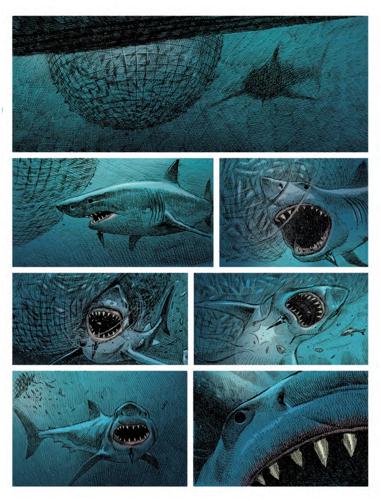 Two old Action faves round out the Special. “Quint Amory” (if you’ve been following these Specials for any length of time you’ll quickly work out who is the writer behind this latest pseudonym) and artist Dan Lish reintroduce perhaps the most well remembered Action character, the killer shark Hook Jaw. This silent tale is moodily illustrated by Lish, feeling intensely claustrophobic despite being set on the vast expanses of the ocean, but essentially it exists as a build-up to a fan-pleasing punchline. It’s admittedly a cracking one and 2000 AD fans of old will love the surprise but while technically inventive it’s the least substantial offering here.