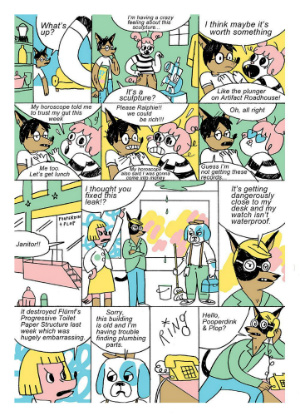 We can also see the theme of being in between youth and adulthood carries over into the design of the smaller characters in the series. Pizzo creates some fantastic Richard Scarry-esque working class plumber and butler dogs, an elderly foreign landlady with the face of Jake from Adventure Time, a tax prep sandwich board dog straight out of a Rodney Greenblat drawing. The combination of children’s book characters and bright crayon coloring further reinforcing that liminal never-never land that our protagonists are in. Ralphie and Jeanie are cartoon characters in a cartoon world, but that’s often how being in your twenties feels.