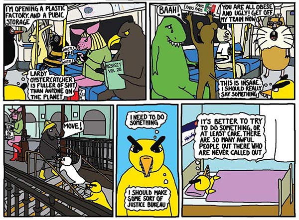 Angry Duck Volume 1 is comprised of one and two-page strips each focusing on one of these creatures behaving badly. However, rather than being episodic or disjointed each page builds on the reader’s mounting disbelief and being able to relate to the experiences portrayed. By the end of the comic we are totally immersed in Angry Duck’s intense world, as he takes down corrupt business lizards, prunes, and elephants; foils rude pigs, lemmings, and sheep; and, most importantly, stands up for the victims of the aforementioned. The very first strip has Angry Duck come to the realization that, “It’s better to try to do something, or at least care. There are so many awful people out there who are never called out.“ KA Sandholm more than succeeds at that with Angry Duck.