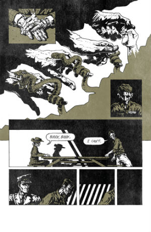 Each segment of the comic is drawn from a few lines of McCarthy’s original prose and illustrates not just a sequence from the book but also Readman’s command of the differing inflections of the language of the form; from the opening set-up of the first two-pages with its river-set and almost nihilistic reflections on the human condition to the near visual poetry of the following prison scene that immediately pulls us in with its motifs of lives ruined and sundered (above left), Readman proves herself adept at that purest form of comics storytelling; an ability to communicate the deepest emotion and theme graphically without undue accompanying exposition.