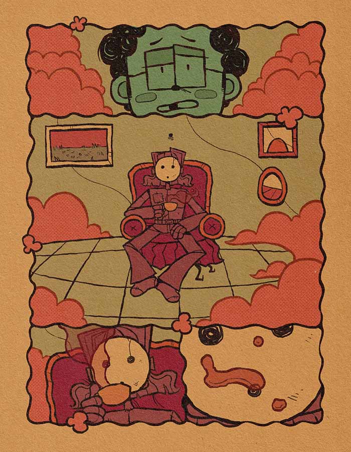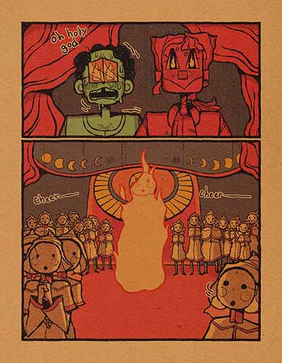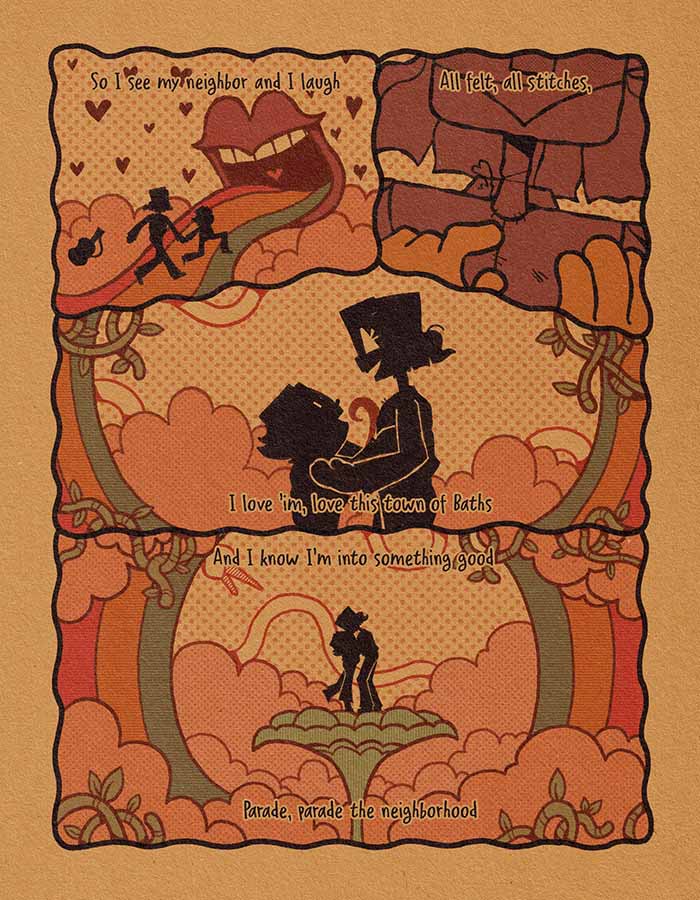 At its heart, Limbo’s graphic novel is the love story between the two trans characters Wegg and Mr. Neighbor. But thematically there’s so much more weaved into that central focus. Be Kind, My Neighbor is also about finding acceptance and one’s place within the LGBTQ+ community, healing, relationships with the body, intimacy, and recovering from trauma. All wrapped up in the trappings of this weirdly rendered vision of Americana.