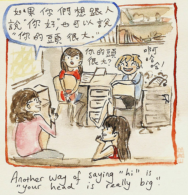 Here’s an example of a comic from this time. It features one of my Taiwanese roommates very helpfully telling my Korean roommate and myself an alternate way of greeting people. (And my Korean roommate innocently repeating it already.)