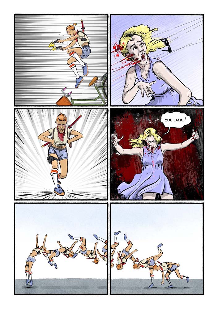 Most offensive to the hunters is that their undead prey are not simply using a supermarket in daylight hours but that their car – a 2019 Opel ‘Combo Life’ – has a sun roof, really rubbing the mortals’ noses in it. What follows in this comics short is not heavy in plot or complex in narrative construction but that’s kind of the point for an exercise that is simply revelling in the fun of a delightfully silly premise and its subsequent execution. It’s simply a violently slapstick extended battle scene, full of wonderfully choreographed silly violence and brutal gore, with plenty of inventive sight gags and one-liners thrown in.
