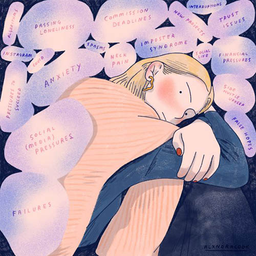 Alxndra (above) has been shortlisted for the World Illustration Awards for her illustration ‘Overwhelmed’ (below) of which she says on the WIA site: “Every now and then I feel the need to create work like this. Something that is so honest and vulnerable that it’s almost scary to post it anywhere. It’s a weird kind of release. If I can’t put this kind of work out there for people to see how can I ever deal with these kinds of emotions internally too?”