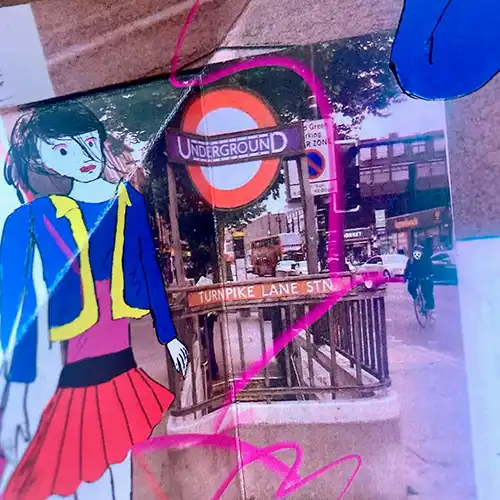 If you want to just take this zine at face value then we have an intriguingly meta piece of short comics storytelling. The Badly Drawn Girl of the title emerging from the gutters between freeform panels to become part of the photographic environment around the aforementioned Turnpike Lane station. Wray also makes ample use of the folds of this cartography to elaborate on that sense of place and cross-media interaction. It’s a fascinating comparison and contrast between the reality of the static caught moment and the fluidity of artistic representation of motion within it.