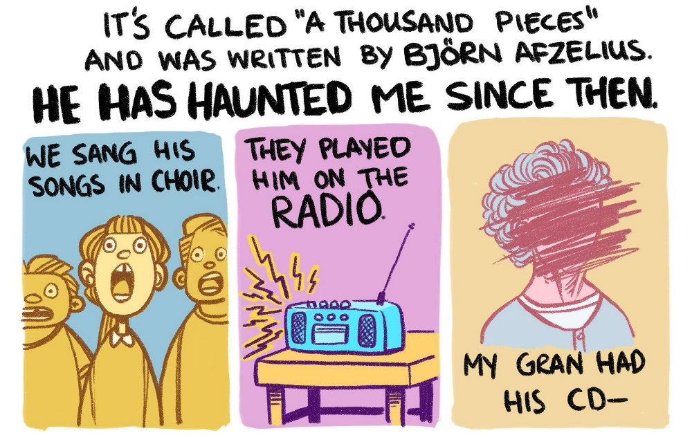 For a number of those involved the singers’ lives are juxtaposed with pivotal points in their own existences when they were first touched by their work, as with Ed Syder and his appreciation of Broadcast’s Trish Keenan or Rica Marsh’s intensely personal connection to Swedish singer-songwriter Björn Afzelius (above). That’s perhaps never better displayed than in Paddy Johnston’s own two-pager on Adam Yauch of the Beastie Boys (below) that covers his own connection to his subject’s work and then transposes the artiste’s outlook on life to the darker topicality of today.