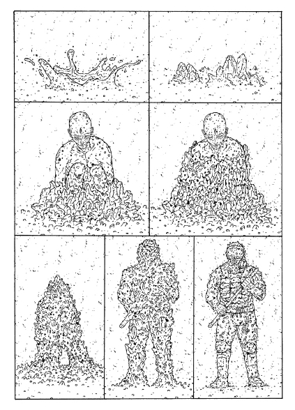 However, while the obliteration of the human form is also a motif in Tsemberlidis’s stories, unlike in Lando’s work, it’s (mostly) treated as a positive thing. Physical forms wither and dissolve, or are otherwise destroyed, in Lando’s comics — all the easier when they are constructed of shaky, thin ink lines — while Tsemberlidis does away with his more solid shells to an almost entirely abstract spiritual rebirth. His stories hint at a sort of transcendence-truth-destruction, a hallucogenic shedding of physical form which is as beautiful as it is violent. “Cyborg M83” is full of imagery of evolution, birth and death, with animals bursting forth from the skulls of other creatures, a synthetic being in the process of being built, and a dead soldier re-entering a cosmic womb to be reborn.
