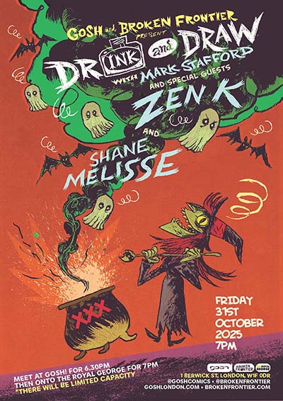 The Gosh! Comics and Broken Frontier Drink and Draw In-Person returns for its fifth revived outing at our new venue of The Royal George on Friday, October 31st, 2025. And this time we have a Halloween Special with guest artists Zen K., Shane Melisse and Mark Stafford.