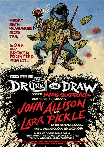 The Gosh! Comics and Broken Frontier Drink and Draw In-Person returns for its sixth revived outing at our new venue of The Royal George on Friday, November 28th, 2025. And this time we have an ace artist line-up of John Allison, Lara Pickle and Mark Stafford.
