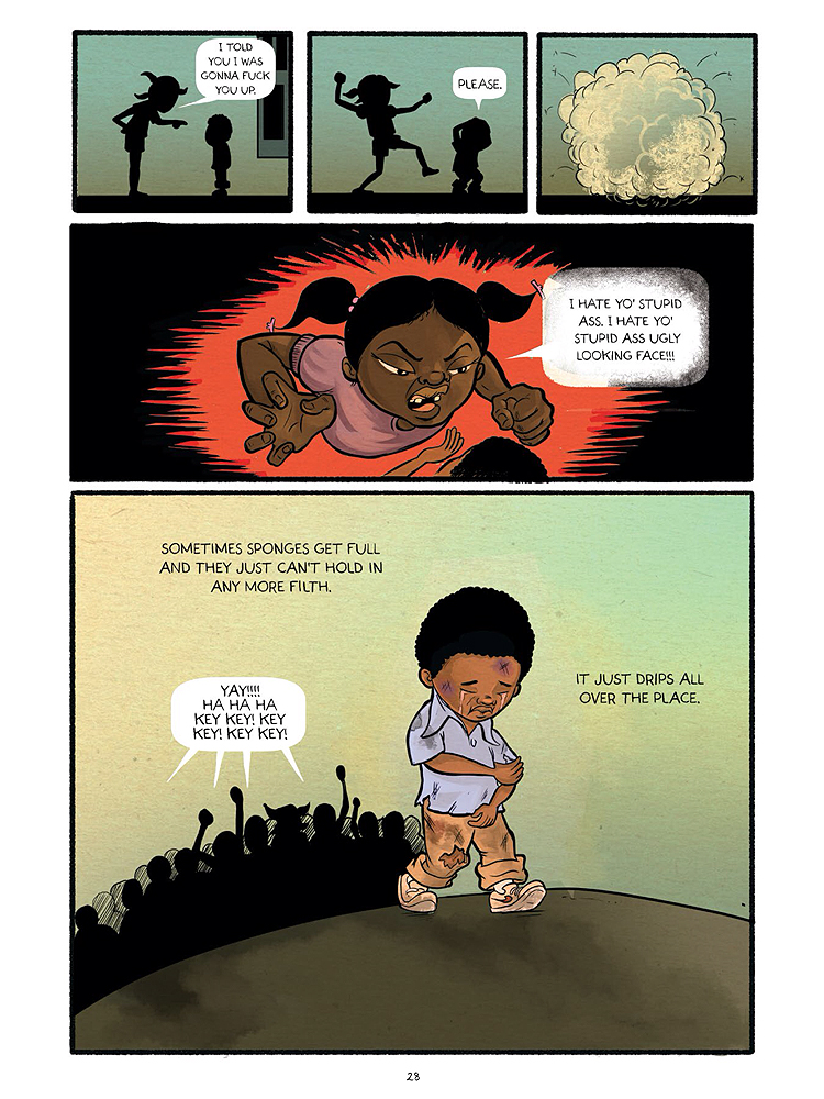 He doesn’t express animosity towards Key Key, the angry and maladjusted young girl who follows through on her promise to “fuck [him] up” on his first day at school. Instead, he invites the reader to consider the toxic factors that might leave a child feeling they have to lash out like that. And he also highlights to younger readers that they don’t have to follow the script they might feel society has written for them.