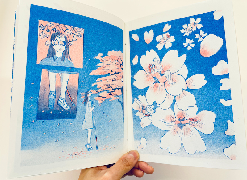 The premise of Fire Flowers takes inspiration from a research-base interview with a friend of Hu’s who lost her sight after a childhood illness. It’s a risographed comic with a fictional narrative that follows Iris, a young blind woman, as she takes a walk around her local neighbourhood, and focusses on how she interacts with her surroundings.