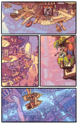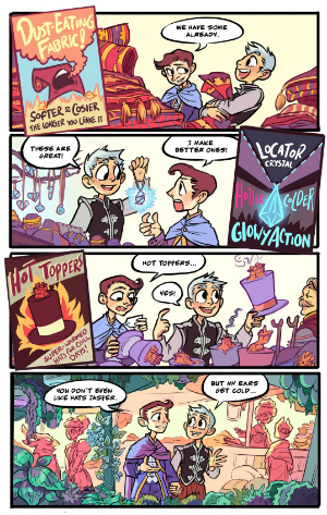 The comic itself centres around the characters Micah and Jasper browsing a local market which houses some humorous magical wares. These include hot-toppers (hats which keep your head warm) and dust-eating fabric – both of which I think should definitely exist! As the characters converse through elegantly coloured panels we discover the rules of the world. Micah is a very skilled wizard for example, whilst Jasper has no magical power; the story drip-feeding these concepts to the reader.