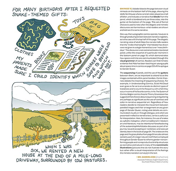 GENDER QUEER: THE ANNOTATED EDITION promises to be a wonderful educational tool for years to come. Along with commentary from Maia Kobabe, the new edition features annotations from fellow cartoonists Jadzia Axelrod (Galaxy: The Prettiest Star) and Ashley R. Guillory (Queers At The Table), cartoonist and editor Justin Hall (No Straight Lines: Four Decades of Queer Comics), cartoonist and educator Kori Michele Handwerker (Tiny Book Science), designer and animator Phoebe Kobabe (Gender Queer: A Memoir), author Hal Schrieve (Fawn’s Blood), cartoonist and comics professor at California College of the Arts Rani Som (Spellbound: A Graphic Memoir), co-creator of Lumberjanes and editor Shannon Watters, as well as original acquiring editor Andrea Colvin. GENDER QUEER: THE ANNOTATED EDITION also includes commentary by prestigious academic figures, including Dr. Sandra Cox (professor of English at Southwest Missouri State University), Ajuan Mance (professor of illustration, California College of Arts), Matthew Noe (Lead Collection & Knowledge Management Librarian at Harvard Medical School), and many more.