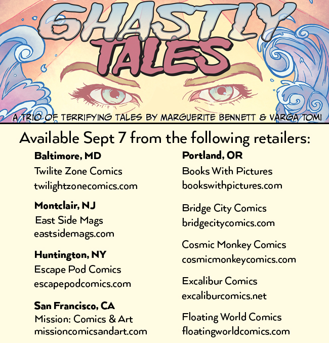 While Ghastly Tales will be available world-wide as a digital release on ComiXology, the print run has been limited to only 400 copies and will not be distributed through the direct market. I was able to work directly with some of the retailers who’ve supported AWBW in the past (mostly in Portland) to make it available in some U.S. shops. These retailers are Twilite Zone Comics in Maryland, Escape Pod Comics in New York, East Side Mags in New Jersey, Mission: Comics & Art in San Francisco and six locations in Portland, OR: Books with Pictures, Bridge City, Cosmic Monkey, Excalibur, and Floating World.