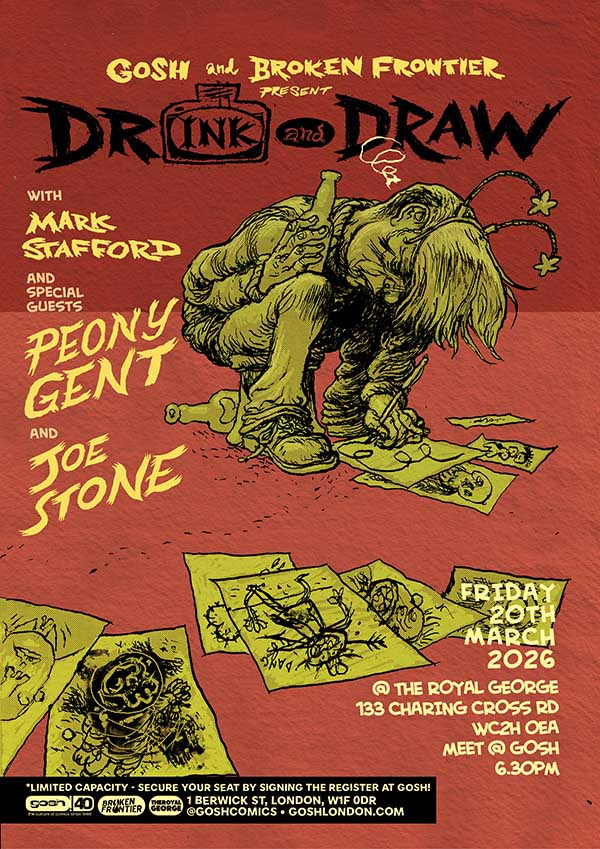 The Gosh! Comics and Broken Frontier Drink and Draw In-Person returns at our regular venue of The Royal George on Friday, March 20th, 2026. And this time we have an awesome artist line-up of Peony Gent, Joe Stone and Mark Stafford.