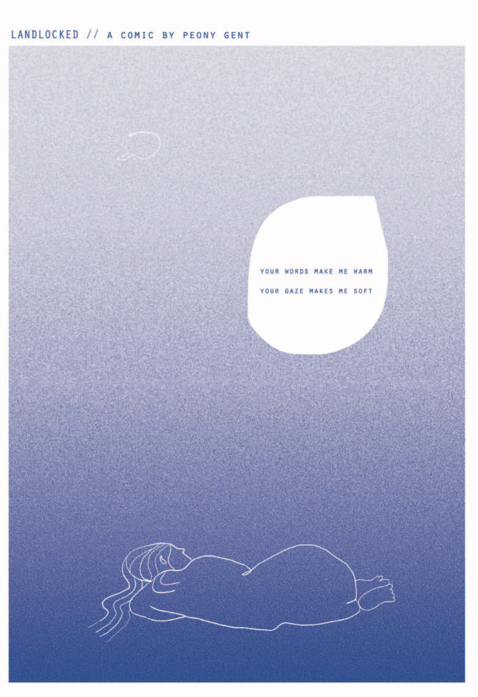 Peony Gent (above right) provides another of her short pieces of distinctive graphic poetry in ‘Landlocked’ proving once again that she is that rarest of creators in any medium – a genuinely unique creative voice. From her minimalist layouts to her subdued and evocative use of blue hues through to her delicate use of language this is one of the true standout offerings of the book.