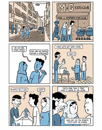 Toulmé looks to bring the complex story of Syria and Syrian refugees to the comics page beginning with Hakim’s life prior to the Arab Spring and before life in the country would change forever. With his safety in doubt after being arrested for helping protestors, Hakim is forced to leave behind his burgeoning plant nursery business and flee to Lebanon. Circumstances see him constantly on the move. While in Turkey he meets another Syrian refugee Najmeh who he marries, and has a son Hadi with.