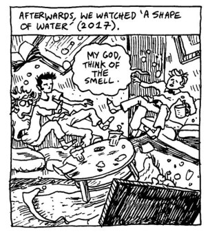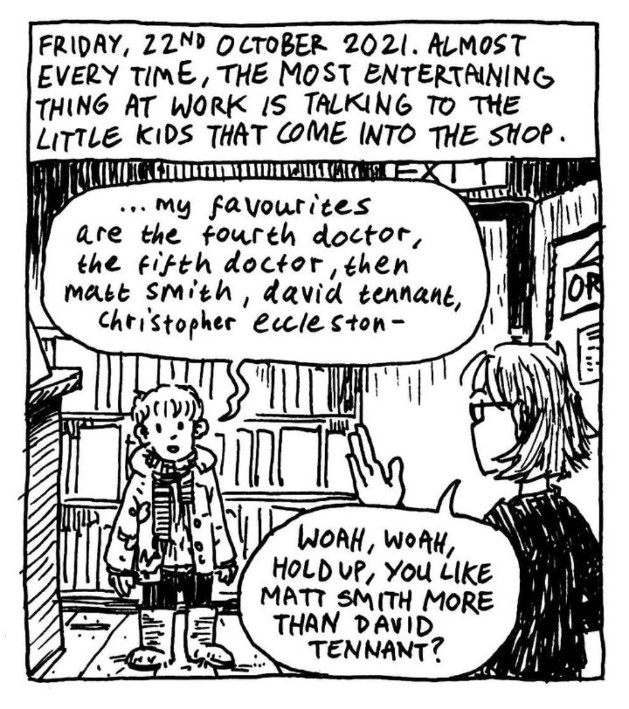 Readman’s workday in Leeds’s much loved OK Comics is a staple of the strips, as is her nightly Halloween horror film marathon with her partner and flatmate which frequently sees their world morphing into reflective cinematic terror. Indeed much of the fun of Handlebar Gumbo is in its flights of representational fancy – Readman’s head exploding from her torso when an Eisner-winning cartoonist compliments her work; an Indiana Jones homage when the shop wi-fi goes down and the team has to rely on the archaic wonders of compact discs; and an entire strip revolving around the exploration of an alien terrain that proves to be something altogether more mundane.