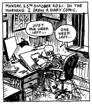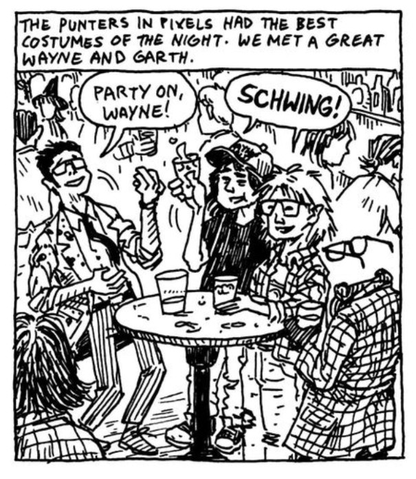 Also of note are the meta flourishes the comic is peppered with like an exhausted Readman in the final panel of the opening strip realising she now has to draw the preceding events of the page, and her lively and energetic cartooning is full of background details that you may not notice on a first reading (a visual gag centring on an Invisible Man costume during the Halloween pub crawl at the comic’s end is particularly rewarding).
