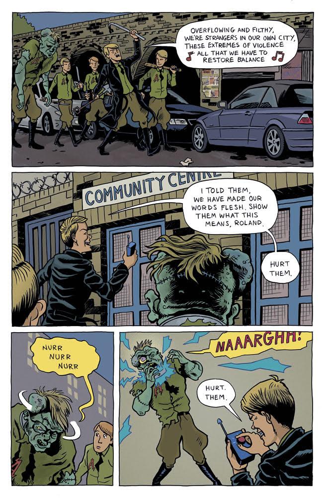 Elsewhere, in his dealings with the schoolyard social hierarchy, Haunted By Robots proves to be a darker incarnation of Peter Parker and there’s more Beatles-inspired psychedelia for Men Behind Guitars. But it’s the storylines surrounding the shadowy right-wing conspiracy that Jack Spatz has been caught up in and the Nazi band Aryan 51 that seem the most prescient here as real world concerns seem to overtake the on-page ones of Cox and Riordan’s fictional reality.
