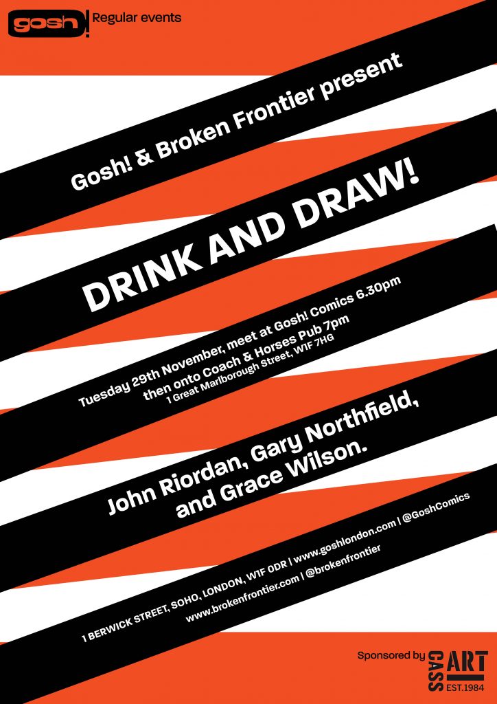 John Riordan is a guest artist at the next Gosh! Comics and Broken Frontier Drink and Draw on Tuesday 29th November. More details here.