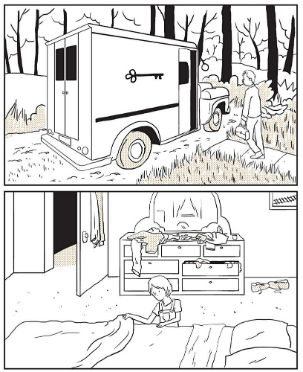 Hobo Mom, published by Fantagraphics, is a more direct collaboration between the two telling the story of a fractured family, the pivotal moment when their lives converge once more and the intricacies of the relationships that both divide and unite them. Since leaving her husband Tom and pre-teenage daughter Sissy some years before, Natasha has been living as a vagrant. Indeed when we first meet her in the book’s early pages she’s riding empty freight trains. In her absence Tom has been bringing up Sissy alone and working diligently as a locksmith.