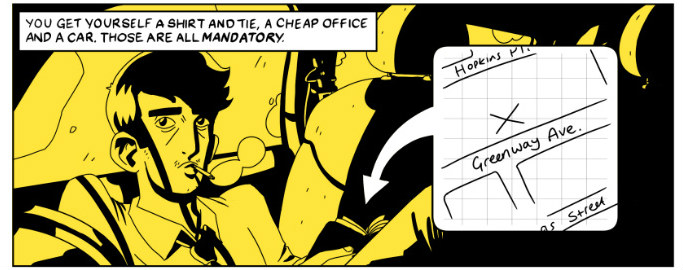 The next story – ‘The Case of the Black Cat’ (below) – takes the reader in another direction altogether, bringing intense yellow and black colouring to the table in its tale of a private investigator and the femme fatale who hires him. Cutaway visual techniques implant the detective’s notes and thoughts onto the main action giving an added sense of the procedural to the sinister proceedings with a feline subplot adding a vein of black humour to the proceedings.