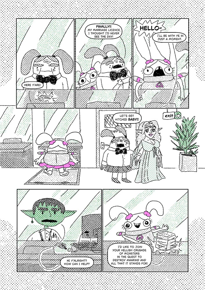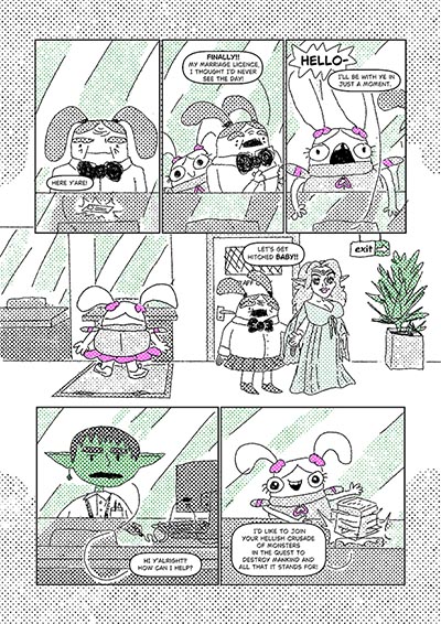 “I’d like to join your hellish crusade of monsters in the quest to destroy mankind and all that it stands for!” That’s a sentence that quickly becomes a most effective running joke in I ♡ Kill by April Newton (aka ApriltheFrog), a madcap fantasy tale that also acts as something of a wittily scathing criticism of pointless bureaucracy.