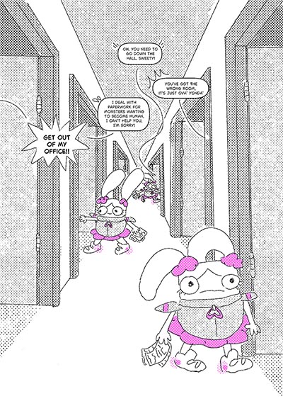 Newton’s page layouts are inventive and constantly shifting in perspective and structure. Particularly memorable examples include a never-ending queue for a service point populated by supernatural creatures, multiple Trolltinas pursuing her targets across a one-panel page, and tighter=panelled poages embodying the petty bureaucracy she faces at various stages.