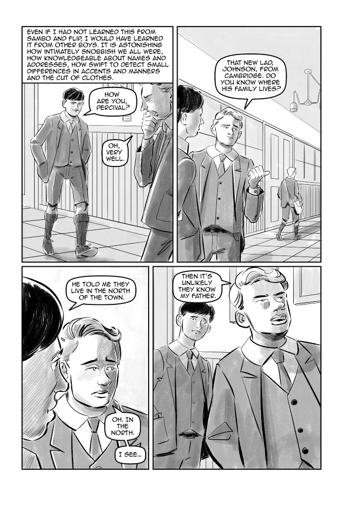 In this scene (page 74) in which the kids are showing off their class, wealth and snobbery, Orwell says that “There never was, I suppose, in the history of the world a time when the sheer vulgar fatness of wealth, without any kind of aristocratic elegance to redeem it, was so obtrusive as in those years before 1914.” And we visualise that in various aspects. But I thought we should also insert an actual conversation to show how this manifests itself in the boys. So this page is almost entirely new.