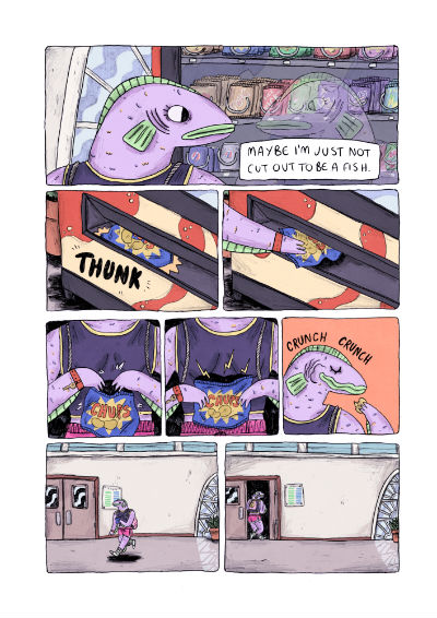 I find swimming pools really gross (and as a consequence I’m a really bad swimmer). This became a huge part of Fish’s anxieties in her story. I wanted to make the pool seem as disgusting as possible, and throughout the comic you’ll see plasters, hairs, and feet all over the place. I had this vision of all the dirt in the pool coming together like an alphabet spaghetti that spelled ‘people soup’, referring to something Fish had called the pool when she was explaining why she didn’t like them. Another important element of the story was Fish feeling a bit stupid and inadequate because she was a fish that couldn’t swim. I really like how the last five panels came out- I was trying to show how having fears about doing something can just make you not be able to do it, even if it’s meant to be easy. I have the same thing about swallowing tablets, even saying “3..2..1..go!” to myself over and over whilst I don’t actually do anything. I usually angry-laugh at myself whilst this happens and I really wanted to put that frustratingly funny feeling across into Fish trying to go underwater for the first time.
