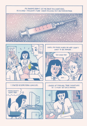 Last year at Broken Frontier I reviewed her comic Is It Vague In Other Dimensions? as part of our annual ELCAF coverage. An account of growing up raised by anti-vaxxer, conspiracy theorist parents. I said of it then “the almost morbidly voyeuristic appeal of this story [is that] the stranger it gets the more captivated the reader becomes. From her mother’s accounts of her past life as an alien insect on Venus (where she met Jesus) to the strange rituals of conspiracy conventions, events just get odder and odder in a rising narrative crescendo of the paranoid and the delusional. And as this catalogue of extreme eccentricity grows ever more unbelievable so too do our sympathies with its protagonist become all the more pronounced.”