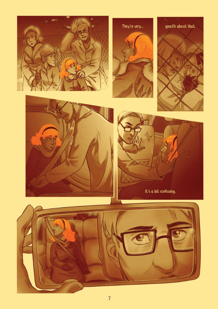 It was probably the most frustrating part of making the book. I made so many test pages trying to evoke the eras I was illustrating. What I had to do was study, basically! I had to learn as much as I could about the limitations of fashion, graphic design, law, and actual historic events so that those limitations could help narrow down what to draw in the different eras. What made it difficult was having not lived in the ’60s-’80s. I remember the ’90s, I can think of what commonly existed on a street, in a house, in a wardrobe. But I can’t picture those things for myself for the other eras, so studying up was the only way to do it! I’ve still got folders full of art and photos that were necessary for putting my mind in the right settings.