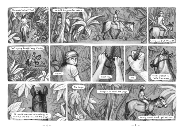 The story ended up being about an explorer who was somewhat obsessed with the Amazon and went missing in Brazil in the twenties. Another of the characters calls the jungle the ‘green hell,’ and I wanted the jungle to be a character in its own right and kind of spread and drip out of its panels. I hoped this would also suggest the way in which it impacted/seeped into all the characters’ lives.
