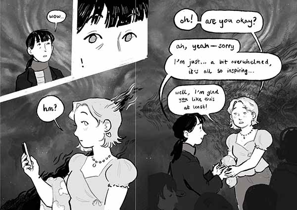 Through stark, black-and-white pencil sketches, Hewitson reflects on the unsettling side of artificial intelligence, and how attempts to generate beauty and meaning through machines can instead create unease, distortion, and disconnection. Mære is only 25 pages long, but it lingers: eerie, incisive, and impossible to forget.