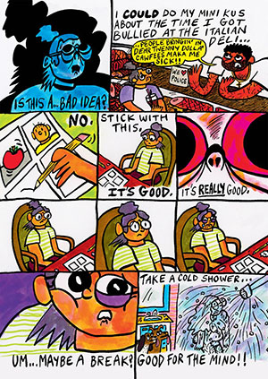 Expecting the unexpected is, of course, a standard when reading one of kuš! comics’ mini kuš! offerings. Heather Loase’s ‘The Boy and the Worm’ in mini kuš! #135 is no exception. It’s a bizarre, rule-breaking exercise in comics narrative that for all its unpredictability and scattered digressions still feels very comfortable in its own rather rambling storytelling. If that sounds like criticism it’s really not. It’s that very air of the erratic that makes this such an appealing read.