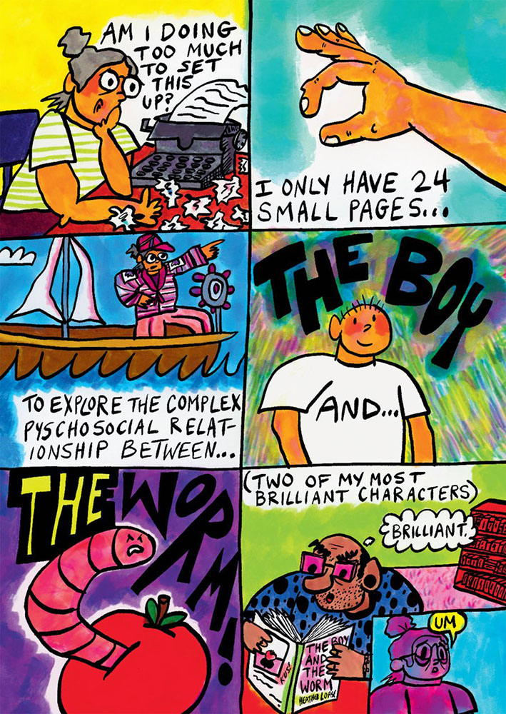 Expecting the unexpected is, of course, a standard when reading one of kuš! comics’ mini kuš! offerings. Heather Loase’s ‘The Boy and the Worm’ in mini kuš! #135 is no exception. It’s a bizarre, rule-breaking exercise in comics narrative that for all its unpredictability and scattered digressions still feels very comfortable in its own rather rambling storytelling. If that sounds like criticism it’s really not. It’s that very air of the erratic that makes this such an appealing read.