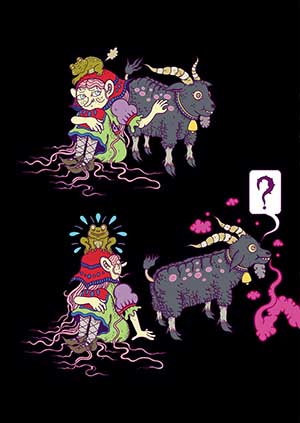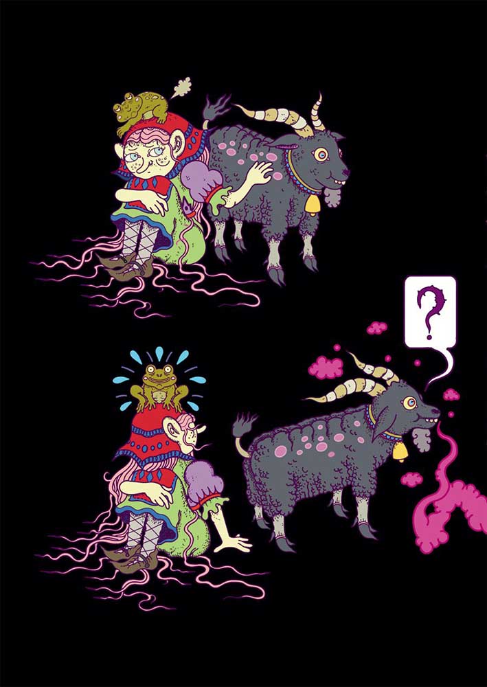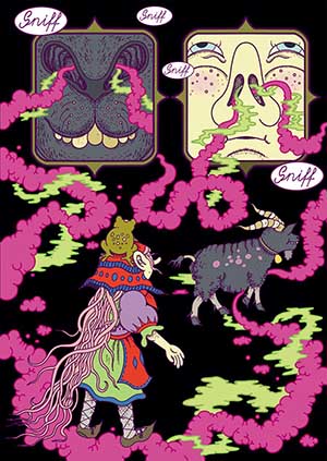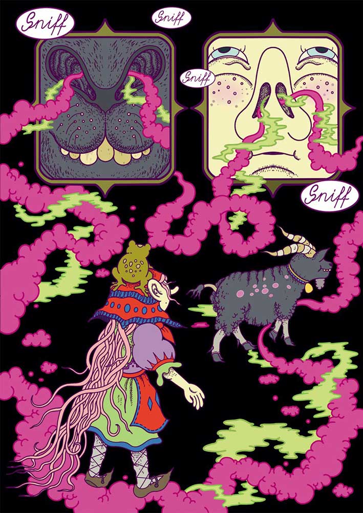 The story is light in plot because it serves primarily as a vehicle for Omut’s fantastical illustration style. A young witch-like individual follows a strange smell of indeterminate origin through a strange otherworldly landscape. The odour in question snakes its way through panels and pages, enticing her ever onwards. As she seeks the source of the smell – her goat companion in tow – we are treated to a tour of her eerie environment and the odd and sometimes monstrous inhabitants therein.
