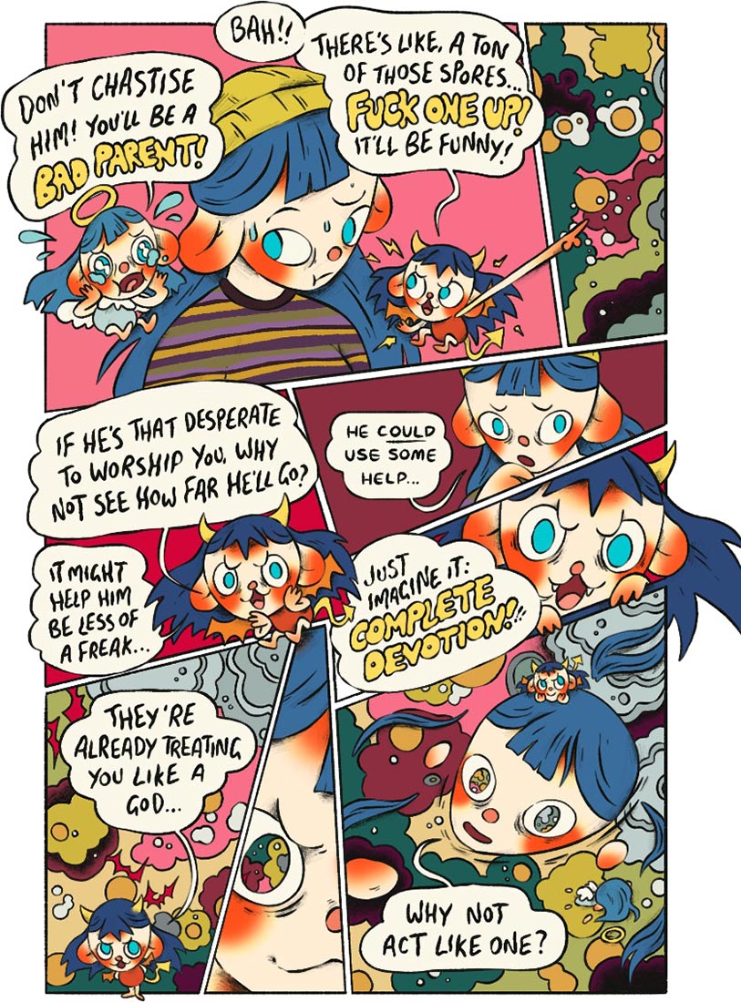 What the reader may feel the most struck by in an immediate sense is Bailey’s use of colour which employs vibrant hues to eerily emphasise the body horror aspects of the piece. Particularly in regards to the mould colony as Sylvie sees it from afar, and also the dinginess and squalor of Sylvie’s surroundings. There are some incredibly visceral scenes in Mother – melting, sliding flesh; the trappings of an unkempt, unclean lifestyle; and evolving, spreading infection – all brought to explicit life with a cartooning style that contradictorily still manages to have its own weird cuteness factor. The use of a narrator to add extra perspective on events is something rarely seen in comics these days but it’s a welcome and useful device here.
