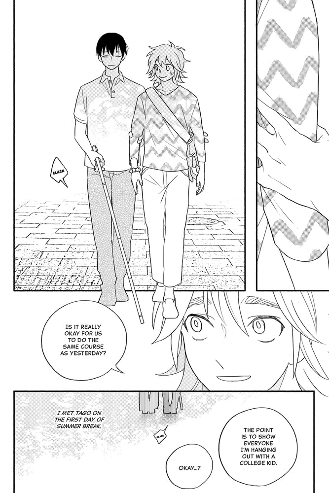 Ogi’s Summer Break is the story of two boys. Haruto Ogi is coming to terms with his sexuality and is shy and unconfident. Shinya Tago is vision-impaired, legally blind and also the object of Ogi’s affection. He’s also self-assured and positive. Ogi feels more comfortable around Tago, thinking his disability means he’s unaware of his lack of poise. But as the two get closer questions arise as to whether Tago really reciprocates Ogi’s feelings. It soon becomes apparent he may be manipulating him to ensure he doesn’t lose his companionship, and that Ogi may be a substitute for another lost relationship.