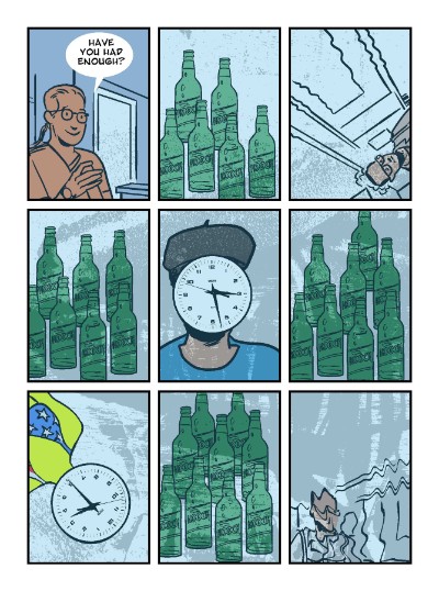 Once There Was Dancing is another clever take on coming to terms with the ageing process, with that title phrase echoing through the comic from its mid-Eighties scene into the present day. As has become so crucial to his communication of the motifs of his tales of late Azzopardi is at his most effective when he brings in those powerful moments of visual metaphor to hammer home the reality of his experiences. In this case a particularly intense sequence where beer becomes an overwhelming sea of wild abandon engulfing him, and time itself takes on an uncaring, anthropomorphised presence as alcohol entrenches itself in his life with seemingly unshakeable roots.