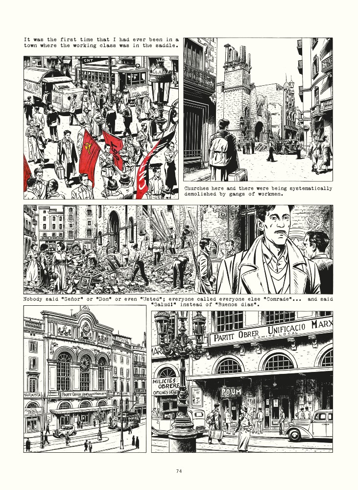Unfortunately, Orwell doesn’t make much of its own suggestion. We’re quickly taken to Orwell’s upper middle class childhood in the home counties, and from there on in the narrative is strictly linear and remarkably uninterested in literary flourishes. Quotes from Orwell’s work are provided in typewriter font, while writer Pierre Christin’s imagination supplies the dialogue. There are also captions which speak in the third person. That there’s three different voices in the book isn’t as confusing as it sounds, but it does alert the reader to the fact that the authors were very concerned with fitting in as much as possible.