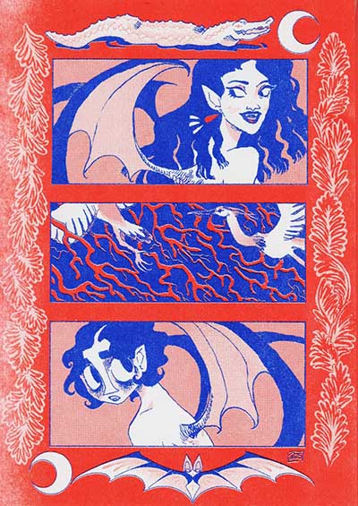 HENDER: Thank you! I took a lot of inspiration from European cartoonists like Kerascoët and Tove Jansson, since their work feels so timeless and sophisticated. There’s also some Aubrey Beardsley inspiration thrown in there, with large swathes of solid black being interrupted by moments of intricate detail. There are a few overt references to extant art – like a very on-the-nose reference to A Streetcar Named Desire and a direct reference to Pénot’s La Femme Chauve-Souris.