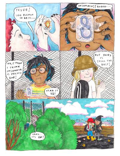 Vähämäki’s art has a childlike innocence which fits its subject matter to perfection; vibrant, eye-catching colour similarly matching both iterations of the reality it encapsulates. Where this perhaps does seem a little less satisfying is that it feels very much like an opening chapter to a much longer project, with many characters introduced in rapid succession with little on-page time. Of course that may well be the case given the practicalities of small press publishing, and one can only hope it is because the world of Amanda Vähämäki’s Pixie Lice is one I would love to revisit in due course.