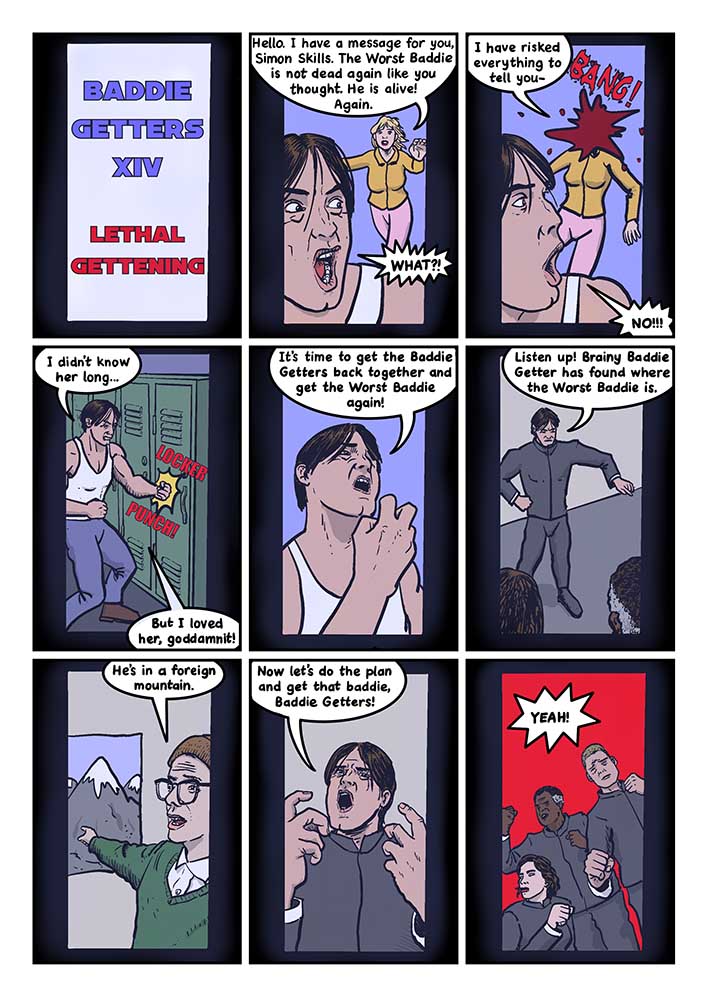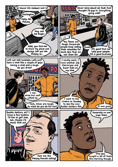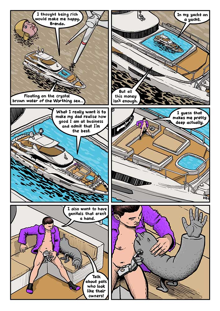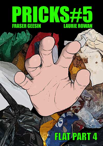 With issue 5, the action ramps up as Roger makes a life-changing decision based on this alternative reality’s version of a feature film; screened in portrait and lasting four and-a-half minutes. Meanwhile Darren, naked and mutated by a local leak of Gammon Radiation from a Willy Wonka style meat processing factory lies comatose from exposure to relaxing shower gel whilst his reputation and life is further destroyed. Will he somehow be awoken by an invigorating shower gel in time to escape death? You’ll have to read Pricks #5 to find out!