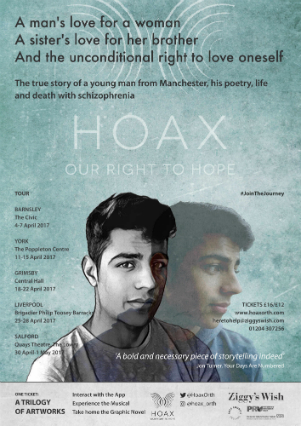 Psychosis Blues was just one part of the HOAX experience however. It was complemented by a sell-out musical play HOAX My Lonely Heart in 2014 acting as a prologue to the book. Thornton’s artistic practice has been notable for embracing cross-media approaches and the HOAX project returns as HOAX Our Right to Hope this year with a third strand in the form of an interactive app. Ravi Thornton talks to me today about the evolution of HOAX as its North of England tour approaches in April…