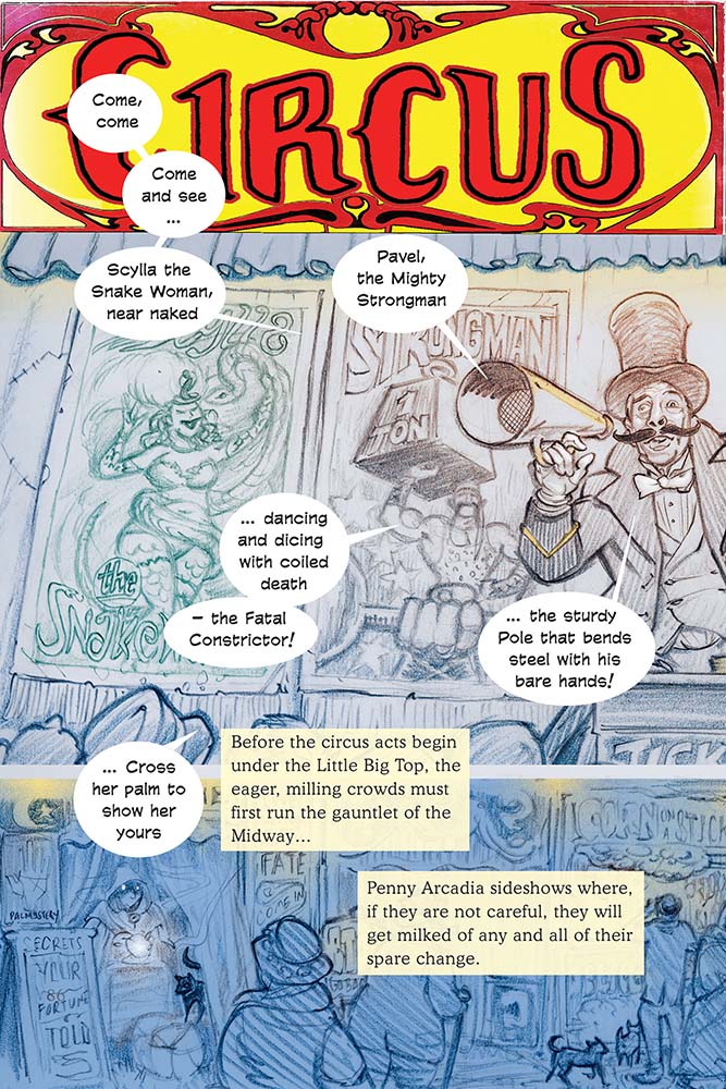 The book is narrated in an episodic structure and follows a Victorian style right from its cover. Instead of the fast and dynamic storytelling in recent graphic novels, Romo the Wolfboy follows a more atmospheric approach that observes the events from a distance. The lack of overt engagement allows readers to immerse themselves in the setting of the circus and feel the mystery.