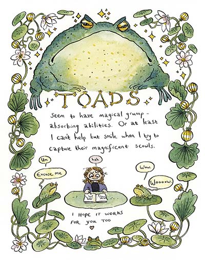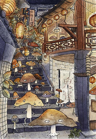 Fox Flight Market Night (above) is beautifully composed work with a gorgeous use of colour to enhance and expand visual storytelling, atmosphere and theme, and panels crammed with detail to revisit. It’s this line of magical worldbuilding that immediately pulls you in. A single image in a print like her Jiufen Mushroom one below creates a whole mythical realm in the space of one illustration. It’s heady, exhilarating stuff.