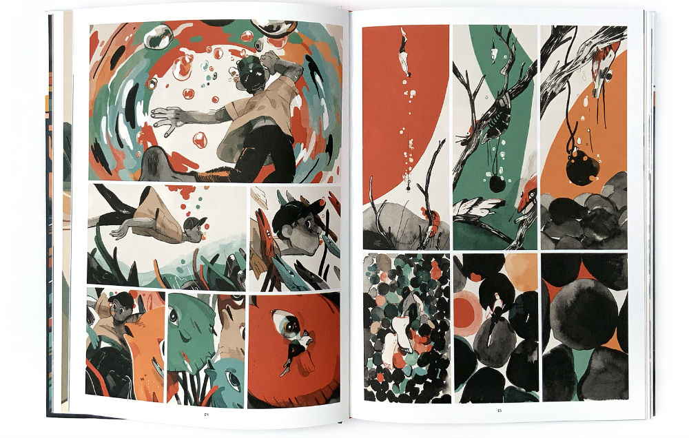 This journey through a wonderland where the surrealism has been ramped up to 11 is a visual tour-de-force. Mendoza’s spectacular use of colour will be the immediate storytelling tool that captures the reader’s imagination. At its most ostentatious it provides a swirling, entrancing kaleidoscope of imagery that is almost hypnotic in its dreamy intensity but Mendoza’s hues are often used more subtly to emphasise either theme or environment.